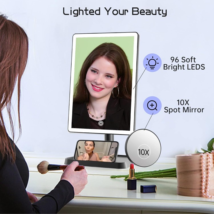Rechargeable Makeup Vanity Mirror with Lights, Large Lighted Desk Makeup Mirror with 96 LED Lights and 10x magnifying Mirror, 3 Color Lighting, Make up Light Mirror with Phone Holder