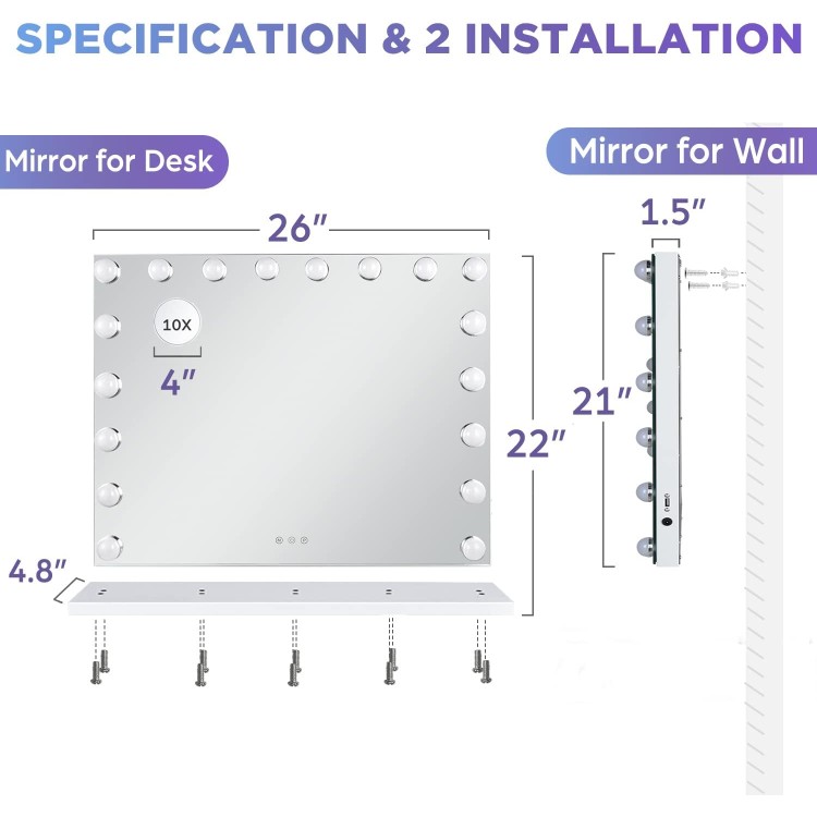 - 【Makeup Mirror in Perfect Large Size】M Mivonda’s vanity mirror is in the perfect size of 26”(L)x22”(W). It is large enough for the comprehensive check of outfit, whole makeup, hair style, etc.